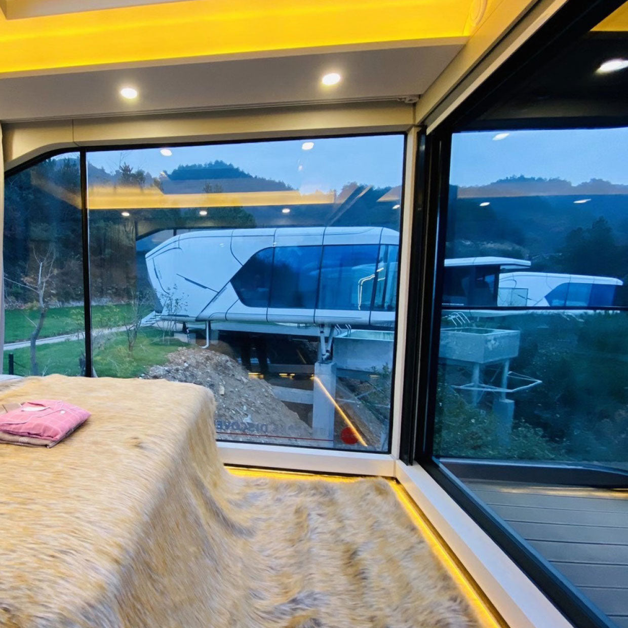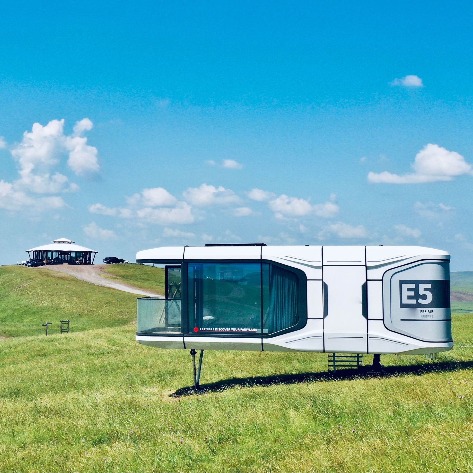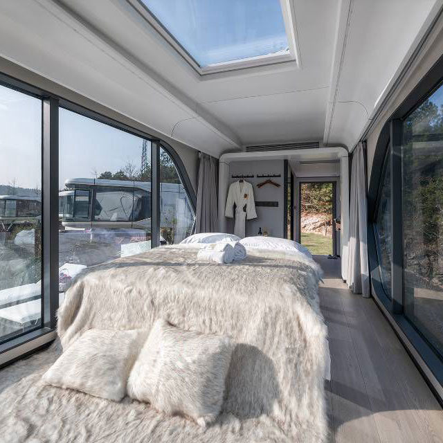Lunar Estate E5 is well-insulated and features panoramic floor-to-ceiling windows, large viewing skylight & terrace, perfect for viewing and entertainment. Its tough, aluminium body is reminiscent of a spaceship, which is full of technology and mystery. Inside the cosy interior, you'll find double room and a king-size bed, everything there can be customise Whether for travellers, adventurers, outdoor living lovers, etc.,